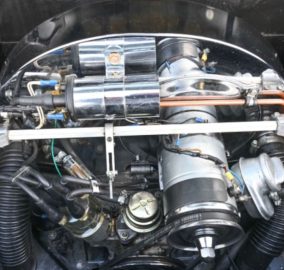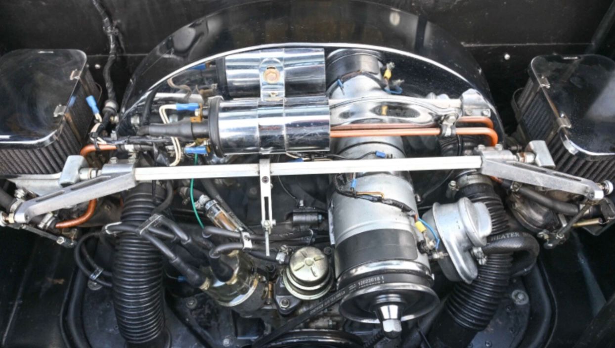 The rear engine cover lifts to provide access to the 1641cc twin-port VW engine. This breathes through twin carburettors with individual, top mounted free-flow air filters. This enlarged version of the erstwhile 1600 Beetle unit is believed to produce around 90bhp and delivers its power to the rear wheels via a four-speed manual transmission.