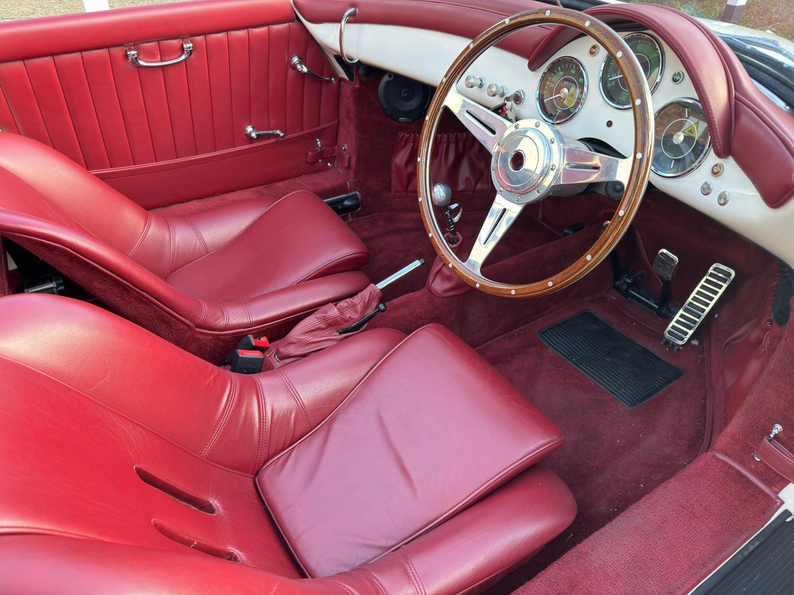 Finished in Old English White with Burgundy Leather, Burgundy Carpets and Black Roof.